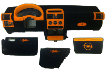 Wir können beispielsweise Markenlogo´s oder Schriftzüge auf verschiedenste Objekte wie Armaturenbretter, Fahrzeughimmel, Türverkleidungen oder in Mittelkonsolen beflocken. Es können auch ganze Innenausstattungen in Konzeptfahrzeugen oder nur Teile der Innenräume beflockt werden.